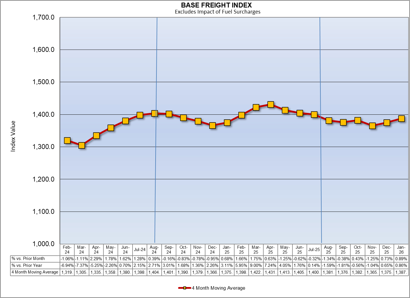 The Base Rate Index, which excludes the impact of Accessorial Charges assessed by carriers, increased by 0.89% in January.