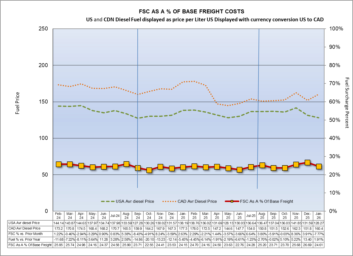 This chart shows the change in Base Freight Costs over the last 12 months for Canadian shippers. The data presented is the same as the General Freight Index above, except that all costs associated with separately identified Fuel Surcharges and Other Accessorial charges has been removed from the analysis.