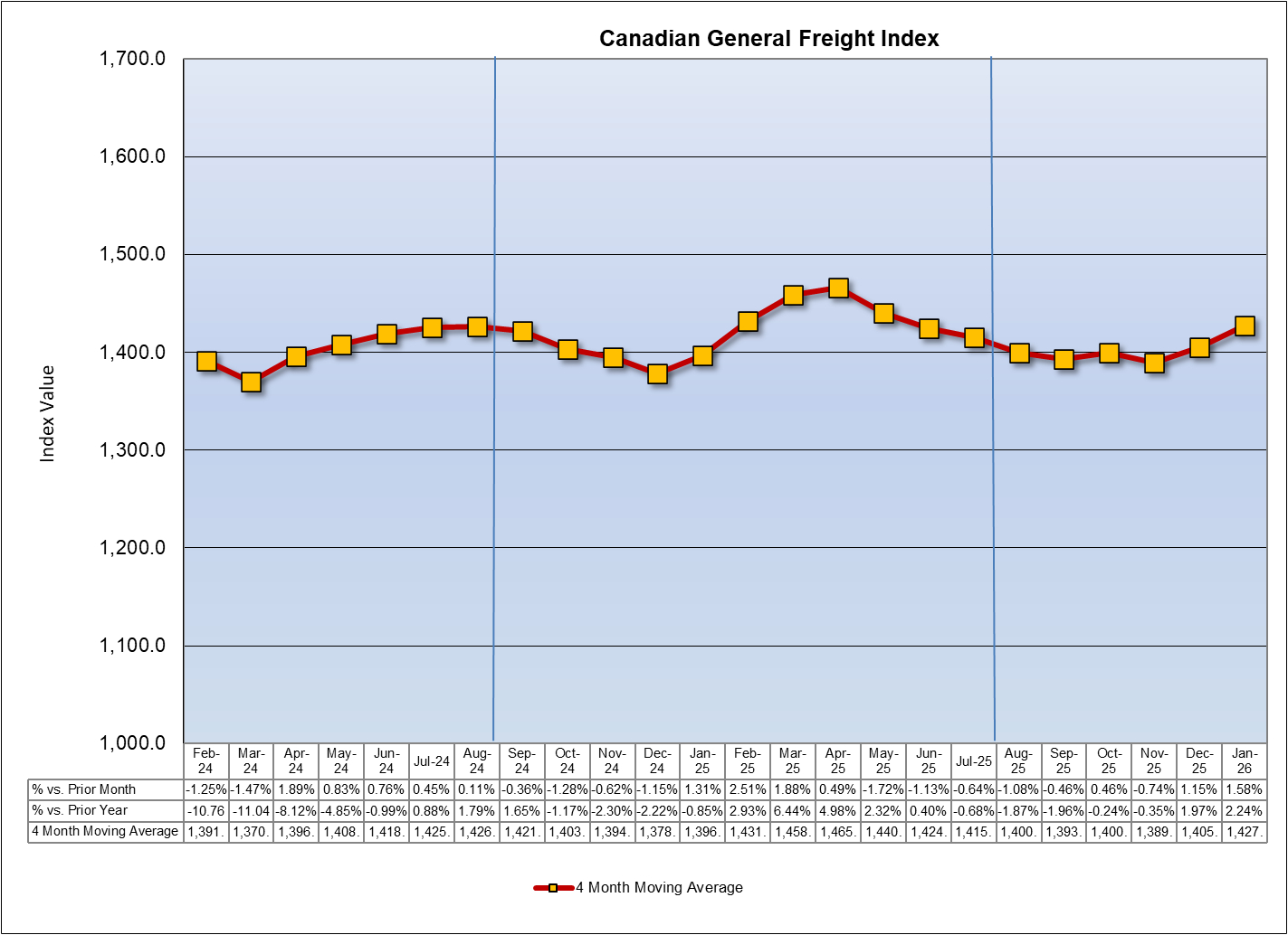 Results published today by the Canadian General Freight Index (CGFI) indicate that the Total Cost of ground transportation for Canadian Shippers increased by 1.58% in January from December costs.